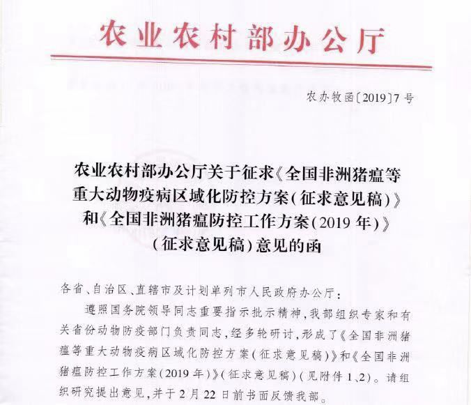 非洲猪瘟防控方案或将发生重大变化!!! 统一推进动物疫病防控、统一协调生猪及其产品调运监管、统一调整优化相关产业布局!2019年2月18日,农业农村部发布非洲猪瘟区域联防意见征求稿,意见指出将全国划分为北部区、西北区、东部区、中南区、西南区五大区域,推进区域内动物重大疫病联防联控,降低疫情扩散风险。 如果方案真的落地将会给行业带来哪些影响? 《农财宝典》新牧网记者 叶嘉宏非洲猪瘟区域联防意见征求!方案落地将为行业带来哪些影响?