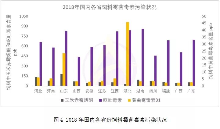 由美国加收中国进口关税而产生的美进口大豆受限,国内饲料企业加大了蛋白含量较高的小麦类饲料原料的使用量。江苏奥迈饲料霉菌毒素工程技术研究中心检测发现,小麦类原料中呕吐毒素含量较高,平均值在1050ppb,超标风险较大。小麦副产品霉菌毒素污染情况与往年基本一致,麸皮和次粉中均存在呕吐毒素污染严重,并且麸皮中黄曲霉毒素B1污染存在较高的风险,建议谨慎使用,注意使用比例。