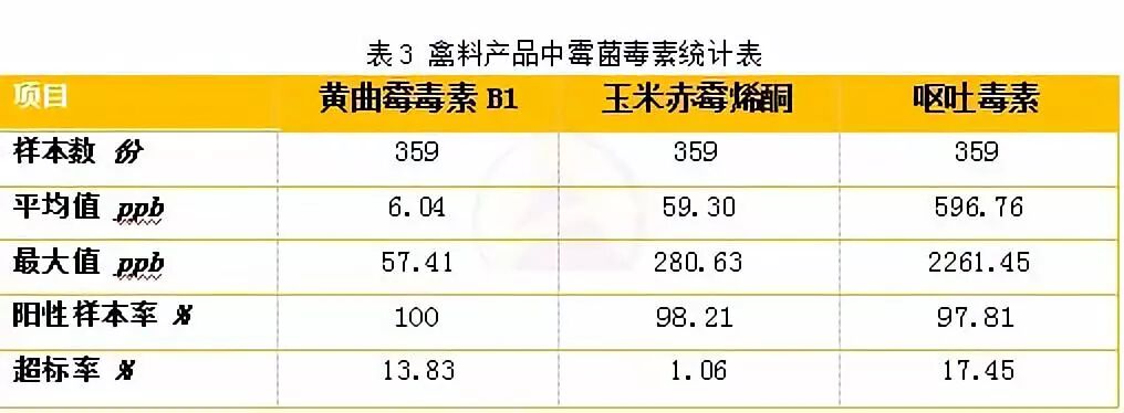 2018年禽料产品中各霉菌毒素含量均维持在较低水平,个别产品存在霉菌毒素超标现象,并且超标剂量极大,需注意原料检测。