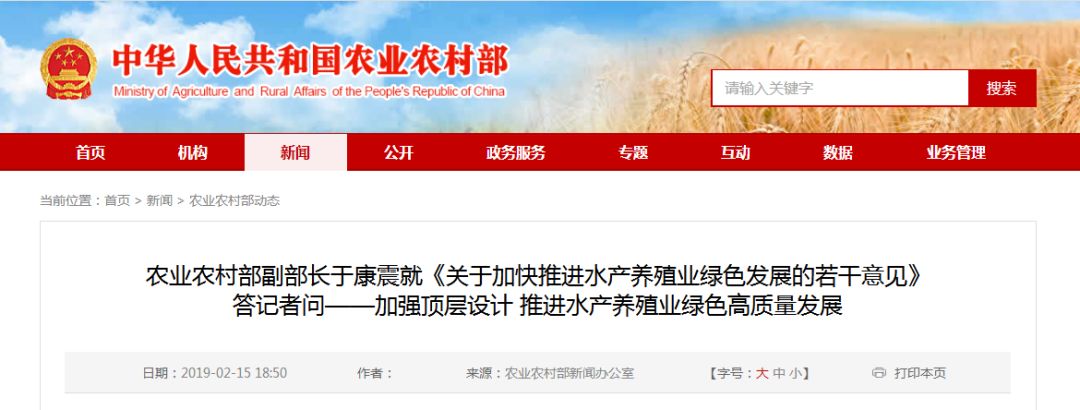2月15日上午,国务院新闻办公室举行新闻发布会,农业农村部副部长于康震就《关于加快推进水产养殖业绿色发展的若干意见》的出台背景、主要内容和工作部署等有关情况进行了介绍,并回答记者提问。农业农村部渔业渔政管理局局长张显良一同出席发布会。 指导水产养殖业发展的纲领性文件 为解决好养殖业绿色发展面临的突出问题,日前经国务院同意,农业农村部会同生态环境部、自然资源部、国家发展改革委、财政部、科技部、工业和信息化部、商务部、国家市场监管总局、银保监会联合印发了《关于加快推进水产养殖业绿色发展的若干意见》。 “这是新中国成立以来第一个经国务院同意、专门针对水产养殖业的指导性文件,是当前和今后一个时期指导我国水产养殖业绿色发展的纲领性文件,对水产养殖业的转型升级、绿色高质量发展都具有重大而深远的意义。”于康震表示。 数据显示,2018年全国水产养殖总产量超过5000万吨,占我国水产品总产量的比重达78%以上,是世界上唯一养殖水产品总量超过捕捞总量的主要渔业国家。水产养殖业的快速发展为解决城乡居民“吃鱼难”、保障优质动物蛋白的供给、降低天然水域水生生物资源的利用强度、促进渔业产业兴旺和渔民生活富裕等都作出了突出贡献。 于康震强调,目前水产养殖业还面临着一些困难和问题。如养殖水域周边污染,水产养殖水域空间受到挤压,水产养殖布局不尽合理,产业的规模化、组织化、品牌化程度较低等等。这些都与水产养殖大国的地位不相称。 加快落实养殖水域滩涂规划制度 禁养转产不能搞“一刀切” 在回答记者提出的关于养殖水域滩涂规划编制发布工作的问题时,于康震表示,养殖水域滩涂规划不是产业规划,而是渔业法规定确立的水产养殖业发展的空间规划,是国土空间规划的重要组成部分,是水产养殖业与其他行业协调发展的基本依据。 于康震指出,只有按照“多规合一”的要求,做到养殖水域滩涂规划符合国土空间规划,并与各专项规划有效衔接,依法科学编制发布养殖水域滩涂规划,才能保障未来水产养殖业发展的空间,维护渔民群众的合法权益。为此,这次《意见》中明确提出,要加快落实养殖水域滩涂规划制度。 从2016年起,农业农村部启动了新一轮的养殖水域滩涂规划编制工作,要求各地合理布局水产养殖生产,依法划定禁止养殖区、限制养殖区和允许养殖区。目前主产县规划编制已经基本完成,77%的主产县政府已发布了规划,下一步将实现全覆盖。于康震强调,养殖水域滩涂规划涉及广大渔民群众的切身利益,空间规划必须要依法依规,不得以产业发展规划替代空间规划,不搞禁养区扩大化,也不搞产业保护主义,该减的要减下来,该留的也要留下来。 而针对社会普遍关注的拆除网箱网围养殖,于康震则表示,在水产养殖业发展的过程中坚持“生态优先”是农业农村部一贯的原则,也是农业农村部义不容辞的责任。同时,我们也发现一些地方在处理水产养殖业发展与环境保护关系的时候出现偏差,比如搞“一刀切”,一禁了之、一拆了之,一律拆除、一律禁养,这种简单粗暴的做法我们是不赞成的。 于康震说,此次《意见》对于拆除网箱网围养殖也提出了明确要求:一是不该禁的不能禁,要科学划定禁养区。坚决防止全区域、全流域、全海域的“一刀切”,盲目扩大禁养范围。二是该禁的要坚决禁,但要给予合理补偿。对于法律法规明确禁养的区域,养殖设施要坚决拆除;对在全民所有水域未依法取得养殖证的,养殖设施也要依法拆除。同时要考虑养殖户的合法权益,要依法给予合理的经济补偿。三是支持养殖户转型升级,实现绿色发展。要通过政策引导和资金支持引导养殖户提高健康养殖水平,提升养殖尾水处理能力,实现生产和环境的协调发展。四是落实养殖者权益保护制度。要稳定集体所有养殖水域滩涂承包经营关系,依法确定承包期;完善水产养殖许可制度,依法核发养殖证。核发养殖证要做到应发尽发、限期发放,绝不能把该发的养殖证锁在政府的抽屉里。对因公共利益需要退出的水产养殖,要依法给予补偿,并妥善安置养殖渔民的生产生活。 水产养殖不等于水体污染 科学养殖有益环境修复 包括养殖水产品在内的水生生物是整个水生态环境的重要组成部分。于康震认为,要想水生态环境好,不能没有水生生物,两者之间并不矛盾。水产养殖从养殖对象上大致可以分为鱼、虾、蟹、贝、藻几个大类;从养殖方式上有两类:投饵型和不投饵型。并不是所有水产养殖品种和养殖方式都会对水生态环境带来负面影响。只有高密度、不合理的投饵型养殖方式才会对环境产生比较大的影响,科学合理的养殖方式不仅不会对环境造成污染,相反还有净化修复的作用。 于康震强调,水产养殖与水环境污染之间不是简单划等号的问题,只有出现了不协调,才会带来水环境污染问题。养殖水域污染有外部的因素,也有内部的因素。严重污染只是个别地方才会出现。尽管如此,我们也必须对水产养殖带来的负面影响给予高度重视。农业农村部高度重视水产养殖生产和环境保护的协调发展,“十二五”期间就提出了“坚持生产发展与生态环境保护并重”,还加上了一条“生态优先”,大力发展生态健康的水产养殖业。 此次《意见》将改善养殖环境作为水产养殖业绿色发展的重