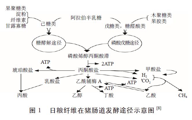 1 日粮纤维对猪肠道微生物的影响 日粮纤维在猪胰腺与小肠内不易被消化,但可被大肠中较高活性的纤维分解菌作为底物发酵,分解产生大量的短链脂肪酸(Short-Chain Fatty Acids,SCFAs)。SCFA 主要由糖酵解途径与磷酸戊糖途径2 种途径产生(图1)。SCFA 主要由乙酸、丙酸和丁酸等组成,对宿主机体代谢、免疫系统与微生物增殖等具有重要作用,是动物机体维持自身生长发育的重要成分。此外,日粮纤维中存在某些可以被肠道内有益菌利用而不被有害菌利用的营养成分, 促进了肠道有益菌增殖使之成为优势菌群,同时抑制了耐酸性病原微生物的生长发育,增强肠道微生态动态平衡的维持。 ● 日粮纤维对猪肠道菌群数量的影响 ➢ Berrocoso 等报道,与没有任何纤维补充的对照组相比,补充纤维组猪的盲肠中大肠杆菌数量减少而乳酸杆菌数量增加。 ➢ Wang 等研究表明, 采用补充15% 的苜蓿纤维日粮饲喂阉割公猪可使其盲肠乳酸杆菌属、脱硫弧菌属显著增加。 ➢ Zhao 等研究发现,5% 麦麸组生长猪粪便中乳酸杆菌与纤维菌显著高于玉米- 豆粕基础日粮组。 ➢ Tan 等研究发现,魔芋粉能够显著提高母猪在第2 个繁殖周期的肠道乳酸菌数量,降低大肠杆菌与梭菌数量。 ➢ Hermes 等研究发现, 饲粮补充24% 的甜菜渣能够显著提高生长猪肠道双歧杆菌与乳酸杆菌数量,降低大肠杆菌数量。 ➢ Haenen 等研究发现,饲喂添加34% 抗性淀粉日粮的母猪与基础日粮组相比,母猪结肠内能够发酵分解纤维菌群中的丁酸菌柔嫩梭菌与瘤胃球菌数量增加,同时大肠杆菌数量下降。 ➢ Berrocoso 等研究表明,与饲喂标准日粮的对照组比较,在43 日龄断奶仔猪日粮中添加甜菜渣(50 g/kg)可降低大肠杆菌比例而增加乳酸杆菌数量。 目前的研究表明,纤维改变猪肠道微生物数量的可能原因:纤维可作为部分微生物的底物,竞争性抑制其他微生物的生长发育;纤维被微生物酵解产生的酸性环境抑制部分致病菌的增殖与发育;可溶性纤维与不可溶性纤维分别对猪肠道微生物作用的异同等等,然而具体纤维是通过何种途径及机制影响肠道微生物,仍然需要进一步深入研究。 ● 日粮纤维对猪肠道菌群多样性的影响 一般来说, 肠道微生物多样性越高,肠道菌群结构越趋于稳定,肠道则更健康。 ➢ Liu 等通过16S rRNA 扩增子测序研究玉米麸改变仔猪肠道微生物及其细胞因子多样性发现,饲喂含5% 玉米麸的仔猪与对照组相比具有更高的shannon 指数,表明玉米麸可增加仔猪肠道细菌多样性。 ➢ 王鹏研究发酵玉米秸秆对育肥猪生产性能及盲肠微生物区系的影响发现,随着纤维含量增加,猪盲肠微生物shannon 指数呈先增加后降低的趋势,但均比对照组高,再次证实了日粮纤维对猪肠道微生物多样性具有促进作用。 ➢ 但Ivarsson研究结果表明,小麦麦麸日粮会刺激猪回肠乳酸菌的生长并产生多种抗菌化合物,抑制其他微生物生长,致使猪肠道微生物多样性降低。 ● 日粮纤维对猪肠道微生物代谢产物的影响 猪肠道菌群主要由细菌、真菌、病毒等微生物组成,其中细菌是猪肠道内优势菌群。猪肠道存在产琥珀酸丝状杆菌、白色瘤胃球菌、黄色瘤胃球菌、栖瘤胃普雷沃菌等可以发酵分解纤维的纤维分解菌,可促进日粮纤维在猪体内的消化吸收。 ➢ Montagne 等研究表明,日粮纤维能够被猪部分肠道内的微生物酵解生成VFA,同时能够抑制病原菌的生长发育,调节肠道菌群结构,进而维持肠道健康。 ➢ Chen 等研究表明,饲喂黄芪纤维日粮的断奶仔猪肠道乙酸、丙酸、丁酸及总SCFA 均显著增加。 ➢ Luo 等研究发现,10% 豌豆纤维组断奶仔猪结肠中乙酸、丙酸、丁酸及总SCFA 分别比玉米- 豆粕基础日粮组增加了52.2%、25.9%、36.7% 和43.6%。 ➢ von Heimendahl 等模拟体外结肠微生态环境研究发现,在日粮中添加甜菜渣,猪结肠中乙酸含量变化差异极显著,由57.54% 上升到61.74%,而丁酸的含量则由10.00% 显著下降到7.97%。 ➢ 但也有不同报道,Gao 等研究发现,虽然饲喂5% 菊粉的生长猪回肠食糜中乙酸、丁酸及总SCFA 均低于对照组,但它们在粪便中含量 却均大于对照组。这可能是由于猪回肠纤维分解菌含量较少,食糜在盲肠等进一步发酵的结果。