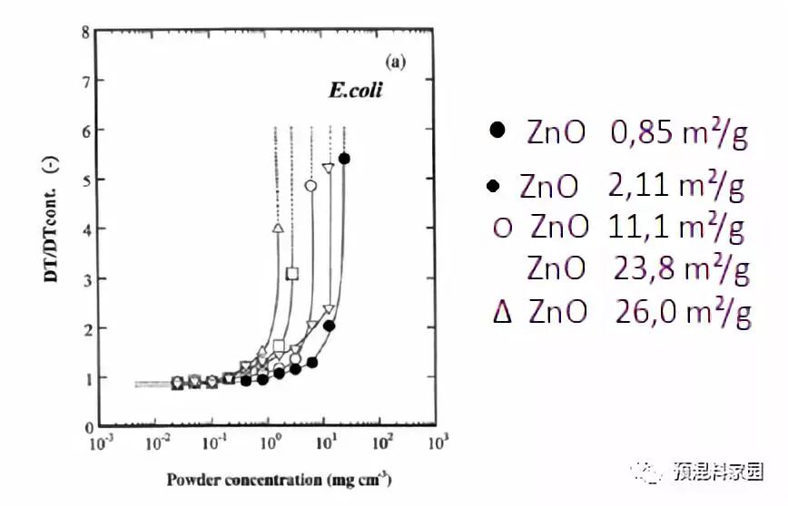图3.氧化锌的表面积对大肠杆菌抑制作用的影响