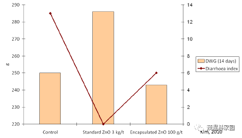 市场上存在不少脂肪包被氧化锌(Fat-covered ZnO)产品,宣称可以低剂量添加达到药理剂量普通氧化锌相当的效果。其主要理论依据是,通过脂肪包被,使氧化锌避免被胃酸中和成锌离子,并在肠道以氧化锌形式释放并发挥作用。然而由于断奶仔猪本身胃酸分泌是不足的,进食时胃内pH值达到4以上,胃酸中和对氧化锌作用的影响程度可能并非想象的那么大;而且由于断奶仔猪脂肪酶的活性极低,可能会影响脂肪包膜内氧化锌的释放。另外氧化锌的作用,可能不仅仅发生在肠道,而且可能在消化道前段(包括胃)发挥不可忽视的抑菌作用,而来自外援病原菌的感染(从口入),可能是影响猪(特别是幼龄仔猪)健康的重要原因。包膜氧化锌的实际应用结果也并不完全一致(见图2),kim等(2010)研究了日粮添加100ppm脂肪包被的氧化锌,并未发现其对大肠杆菌攻毒的21日龄断奶仔猪腹泻控制和生长成绩有益。