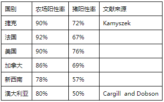 尽管每一个流调结果并无相关性,但对比90年代、00年代与10年代的流调结果我们发现,寄生虫在猪场的感染率并没有降低的趋势。国外猪场寄生虫感染情况如何呢?下表是部分发达国家在90年代至00年代疥螨的流调结果。