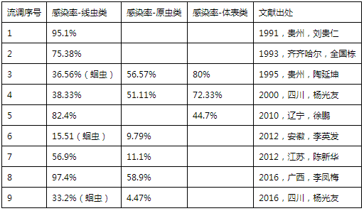 由于规模化程度的改变,养殖生产者对寄生虫病控制的意识得到加强,与早年相比部分种类的寄生虫感染率确实明显降低,如绦虫近年基本难得一见。而事实上猪常见寄生虫仍然广泛流行,无论是流行率还是感染压力都还很高,如果防控不到位寄生虫病对经济效益的影响仍然很大。下表是笔者收集并总结过去近30年部分流行率调查结果以供参考。