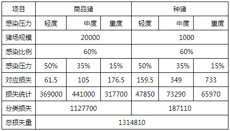 再根据1000头母猪的规模,按照猪只阳性率为60%,而轻度、中度、重度感染分别占阳性猪群的15%、35%、60%即可计算该场年经济损失总量。