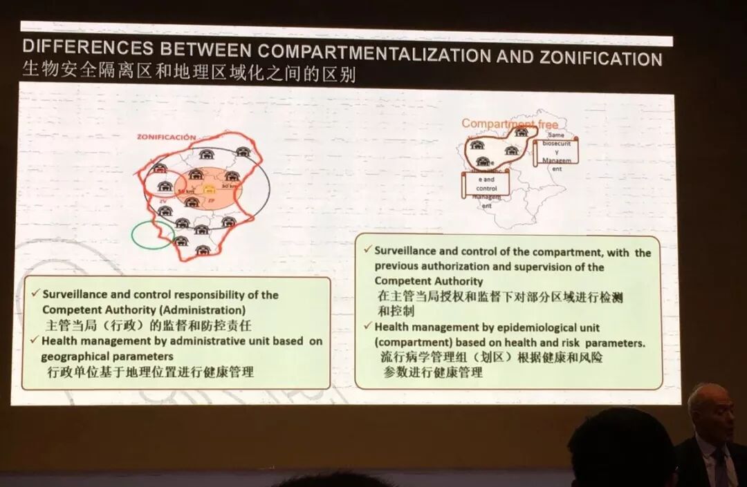 世界动物卫生组织官方推荐的非瘟防控模式:生物安全隔离区模式 流行病学在建立隔离区上,扮演着非常重要的作用。其实任何国家都无法阻止(例如携带禽流感病毒的)野鸟,或者(是携带非洲猪瘟的)野猪去进入农场或者生产区域,这是人为无法控制的。对于这类可以通过野生动物去传播的疾病,其实更好的方法应该是通过划分生物安全区,来进行疾病控制,才可能会在家畜中建立一个没有疾病的健康状态。这是世界动物卫生组织官方推荐的方式。 中国目前采用的非瘟防控模式,是按照地理区域划分的疾病控制模式,即区域性封锁生猪调运。 刚才讲到的左侧防控模式,即按照地理区域划分的疾病控制,这个方法在欧盟很多地方也在使用,如荷兰,德国,西班牙。同样采用地理区域划分方法的还有罗马尼亚等东欧国家。同样,这也是中国目前所采用的方法。 但这是有限制条件的,如在荷兰,德国,西班牙,都有很多生物安全级别很高的省或者州,都有着生物安全状态很好的大规模农场。而中国则和东欧国家比较接近,是既有规模化养殖场,也有野猪的出没,还有一些散养户等。 按照地理区域划分方法存在着弊端: 一些生物安全比较好的养殖场并没有爆发疾病,但可能在它周围一定区域内会有一些散养户或野猪存在。如果简单采用地理区域划分来控制疾病的话,若一家养殖户爆发非瘟,整个区域都会被封锁。而这些没有发生疫情的养猪场因为被封锁,无法将猪调运出,可能面临每周要宰杀9000多头猪的惨状! Sanchez教授认为此种方法很激进!在此模式下即使是欧盟养猪人也很难受。 例如在德国,曾有三个生物安全级别很高的养殖场,尚未爆发非瘟疫情。但由于在养殖场周围发现了非瘟呈阳性的野猪,那么这三个养殖场所在的整个区域都被封锁。 这是种很荒谬的做法,野猪的活动范围是未知且不可控的,它们会出没在任何区域。而农场则是固定的。如果按照地理区域划分来进行封锁,只要发现该区域内有野猪出现~非洲猪瘟呈阳性,则该区域被整体封锁。这样的方案合理吗?答案显然是不合理的,是激进的,是疯狂的! 国内散养户与野猪出没给规模养殖场带来的疫情风险,其实是接近的。 散养户带来的风险与野猪带来的风险虽然是两种不同模式,但这两种模式给规模养殖场带来的风险实际上是接近的。相对于生物安全级别较高的养殖场,散养户和野猪的生物安全性都不高。所以如果在同一个区域内,一旦存在散养户或野猪检测出病体呈阳性,则该区域内生物安全状态很好的养殖场也都会被封锁,禁止生猪调出。这是按地理区域划分非常不合理的地方。 而按照生物安全划分的隔离区能很好解决此问题。 在第一种区域划分的状态下,完全按照地理划分,是不合理的。因为生物安全很好的农场被封锁,生猪却无法运出,会造成巨大的经济损失以及引起极端的地域性价格差异。 但如果同样的情况,用生物安全来划分区域,就会很好地解决! 理解什么是按生物安全划分隔离区? 一个生物安全隔离区需要包含: 一个单一的生产单位,例如种猪场,或几个机构,例如,与它们相关的几个农场和单位(饲料厂,屠宰场,运输,加工厂,垃圾场,焚化炉),构成一个完整的生产循环,其中所有的活动物或者病原体均属于此生物安全隔离区。 例如有几家农场,没有集中在某个省或者某个州,而是遍布在国家的各个区域。但是,这几个农场会共享在同一生物安全体系内:他们拥有相同的管理体系,饲料来源,共用的屠宰场,共用运输车辆等。在国内来说就是集团化养殖企业。 如果这些农场周围散养户出现了非瘟病例,运用生物安全划分的方法,则依然可以把场内的生猪运输到和他们拥有同样生物安全的农场。 这种模式可能会遇到的问题: 我们一直所说的生物安全状况好的农场,是假设这些场内无猪只发病。但如果这种规模化养殖场也出现了病情,该怎么办? 在生物安全隔离区的体系内,如果集团内部有某个养殖场出现病情了,那么,只需停止这一家养殖场的生猪调出!同时还要做到:要做到体系内的排查,看该发病的养殖场对集团内其他养殖场的影响。如果影响比较低,则只需把这个养殖场关闭即可。如此,集团内其他养殖场依然可以进行相互之间的运输。 另一状况:现在发病的猪只,病毒检测是需要时间的。在等待的时间内,如果发病猪已经运到屠宰场了且已经被宰杀,该如何处理? 如果这只猪确定是非洲猪瘟感染的猪只,那就需要关闭该厂的生产了。另外,需要理解的概念是,所谓的生物安全体系内是指,不同农场之间,管理水平,健康状况,都是相同的或接近的,才能称为同等的生物安全状态。例如供应链,供应链内所有的监控、车辆、管理等都是处在同一水平线或者都是同一个团队在做。不同的农场之间,使用着相同的供应链,才能处在相同的生物安全体系。这就是按生物安全水平划分隔离区。 中国目前最大的问题应该是屠宰场! 其实最大的问题是屠宰场,因为屠宰场很难纳入一个相同的体系,它会接收到各种来源的生猪,屠宰场是一个交叉污染的地方。因为屠宰场和买卖是相连的,生物安全级别最低,很难纳入到这个级别里。该怎么办呢? 这里是有些国情差异的。在西班牙,很多集团内部是没有屠宰场的。但是其中两到三个集团会共用一个屠宰场,并划分不同的使用时间。例如,某集团每周使用几天(如周一至周三),另外的集团每