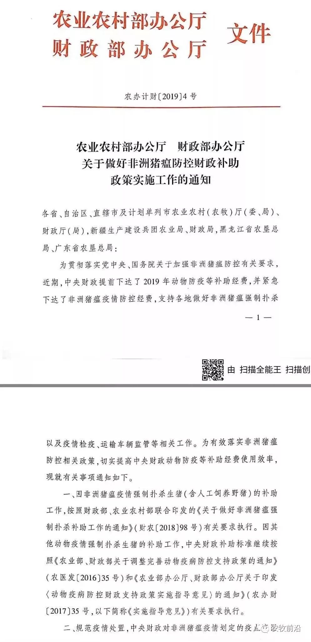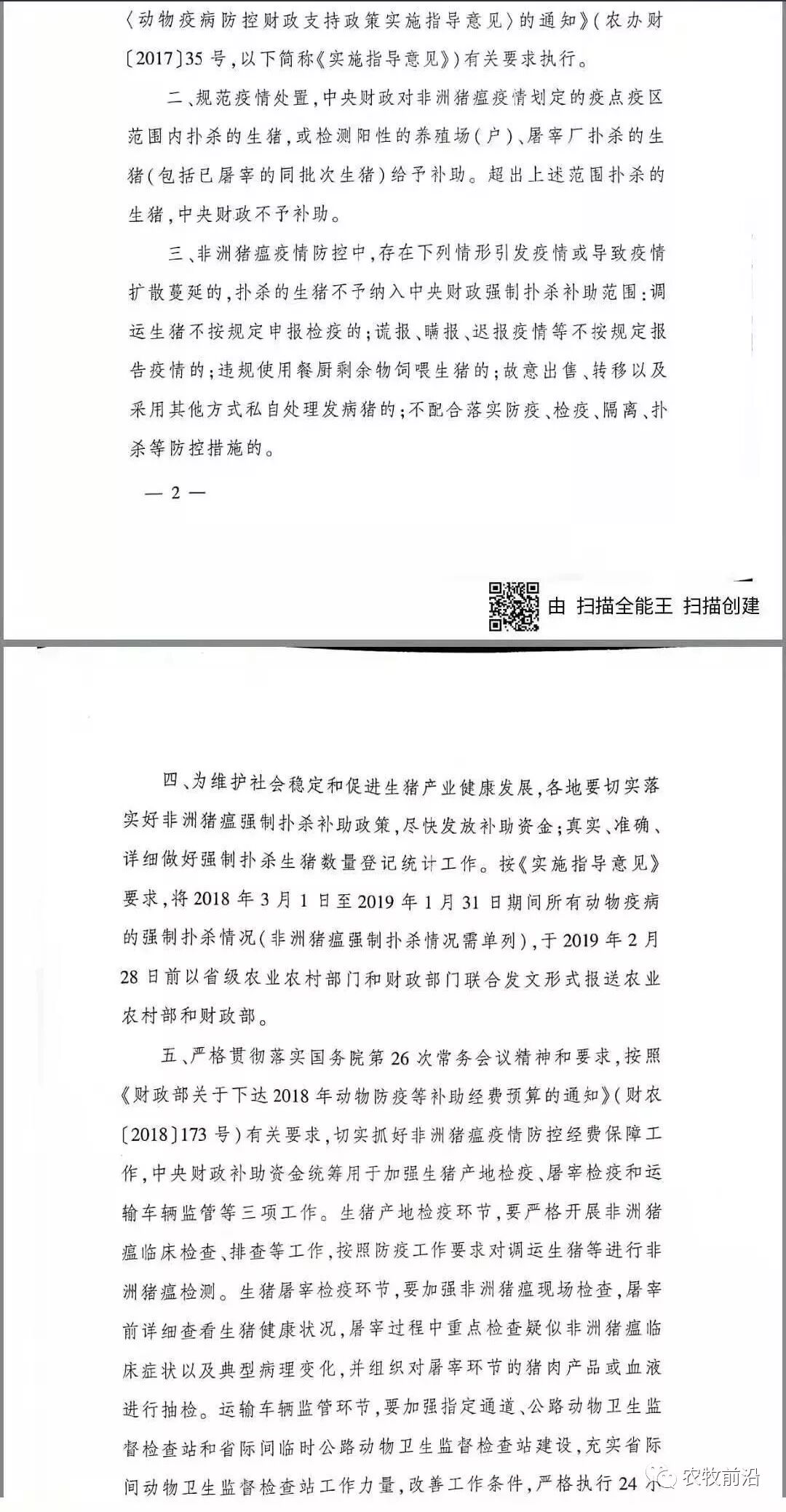 2月19日,农业农村部办公厅财政部办公厅印发《关于做好非洲猪瘟防控财政补助政策实施工作的通知》。通知要求: 非洲猪瘟疫情防控中,存在下列情形引发疫情或导致疫情扩散蔓延的,扑杀的生猪不予纳入中央财政强制扑杀补助范围:调运生猪不按规定申报检疫的;谎报、瞒报迟报疫情等不按规定报告疫情的;违规使用餐厨剩余物饲喂生猪的;故意出售转移以及采用其他方式私自处理发病猪的;不配合落实防疫、检疫、隔离、扑杀等防控措施的。 为维护社会稳定和促进生猪产业健康发展,各地要切实落实好非洲猪瘟强制扑杀补助政策,尽快发放补助资金;真实、准确、详细做好强制扑杀生猪数量登记统计工作。按《实施指导意见》要求,将2018年3月1日至2019年1月31日期间所有动物疫病的强制扑杀情况(非洲猪瘟强制扑杀情况需单列),于2019年2月28日前以省级农业农村部门和财政部门联合发文形式报送农业农村部和财政部。 切实抓好非洲猪瘟疫情防控经费保障工作,中央财政补助资金统筹用于加强生猪产地检疫、屠宰检疫和运输车辆监管等三项工作。生猪产地检疫环节,要严格开展非洲猪瘟临床检查、排查等工作,按照防疫工作要求对调运生猪等进行非洲猪瘟检测。生猪屠宰检疫环节,要加强非洲猪瘟现场检查,屠宰前详细查看生猪健康状况,屠宰过程中重点检查疑似非洲猪瘟临床症状以及典型病理变化,并组织对屠辜环节的猪肉产品或血液进行抽检。运输车辆监管环节,要加强指定通道、公路动物卫生监督检查站和省际间临时公路动物卫生监督检查站建设。 地方各级财政部门要会同农业农村部门按要求落实好非洲猪瘟防控财政补助政策,严格按照支出方向使用资金,确保资金及时落实到位,切实强化资金使用监管和绩效考核,对虚报冒领、骗取套取、截留挪用中央财政补助资金以及违反规定使用等行为,一经查实,按照《财政违法行为处罚处分条例》等相关规定严肃处理,涉嫌犯罪的,移送司法机关处理。