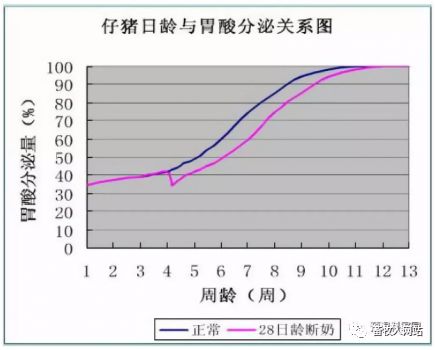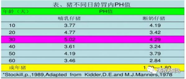 断奶前的仔猪,由于吸食的母乳中含有大量乳糖,在胃内乳酸杆菌的作用下转化成乳酸,使胃内 PH 值保持在 4 时即可很好的消化乳蛋白。而早期断奶仔猪的消化系统和免疫器官发育不完善,消化道中酶和胃酸的分泌不足(见上图),并且由于从母乳为主突然改变到以采食固态饲料后,还会引起胃内 PH值的大幅度升高,可达到 5.5 以上(Manner 等 1984),大量试验认为胃蛋白酶要求的最佳 PH 值为 2.0—3.5,当 PH>4.0 时活性减弱甚至失活。一般认为一头 28 日龄的断奶仔猪每天只能分泌相当于20ml1mmol 盐酸的胃酸,所以在断奶后的第一天能消化的饲料不超过 57g,多采食的饲料就不能被仔猪很好的利用,未被消化的饲料随着食糜进入消化道后段在有害菌的作用下产生肠毒素,从而导致仔猪下痢;而当加入酸化剂后降低了饲料的系酸力,相应胃内 PH 值下降,可以进一步提高胃蛋白酶的活性,消化的饲料量相应上升。酸化作用还能降低胃部食糜排空速率,这对营养物质得到更充分消化有利。同时肠道内容物的酸度也影响胰蛋白酶. 糜蛋白酶. 羧肽酶. 淀粉酶. 脂肪酶. 麦芽糖酶和乳糖酶的分泌和活性。