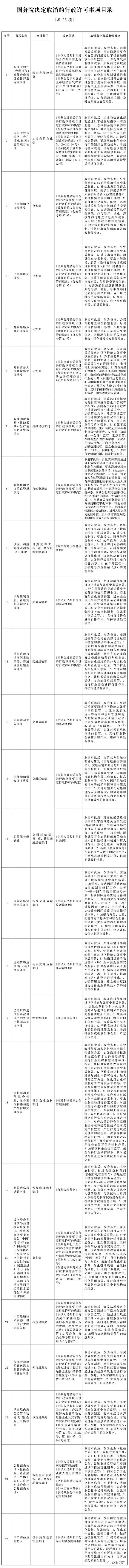 经研究论证,国务院决定取消25项行政许可事项,下放6项行政许可事项的管理层级,现予公布。另有5项依据有关法律设定的行政许可事项,国务院将依照法定程序提请全国人民代表大会常务委员会修订相关法律规定。