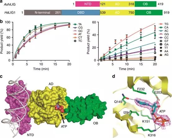 AsfvLIG包含四个独特的残基,包括AD域的Asn 153和Leu 211,以及OB结构域的Leu 402和Gln 403。虽然他们不参与直接催化过程,这些残基可能与其相应的NTD或DBD结构域协同工作,这些位点残基对缺口的识别和催化效率有着重要的意义。