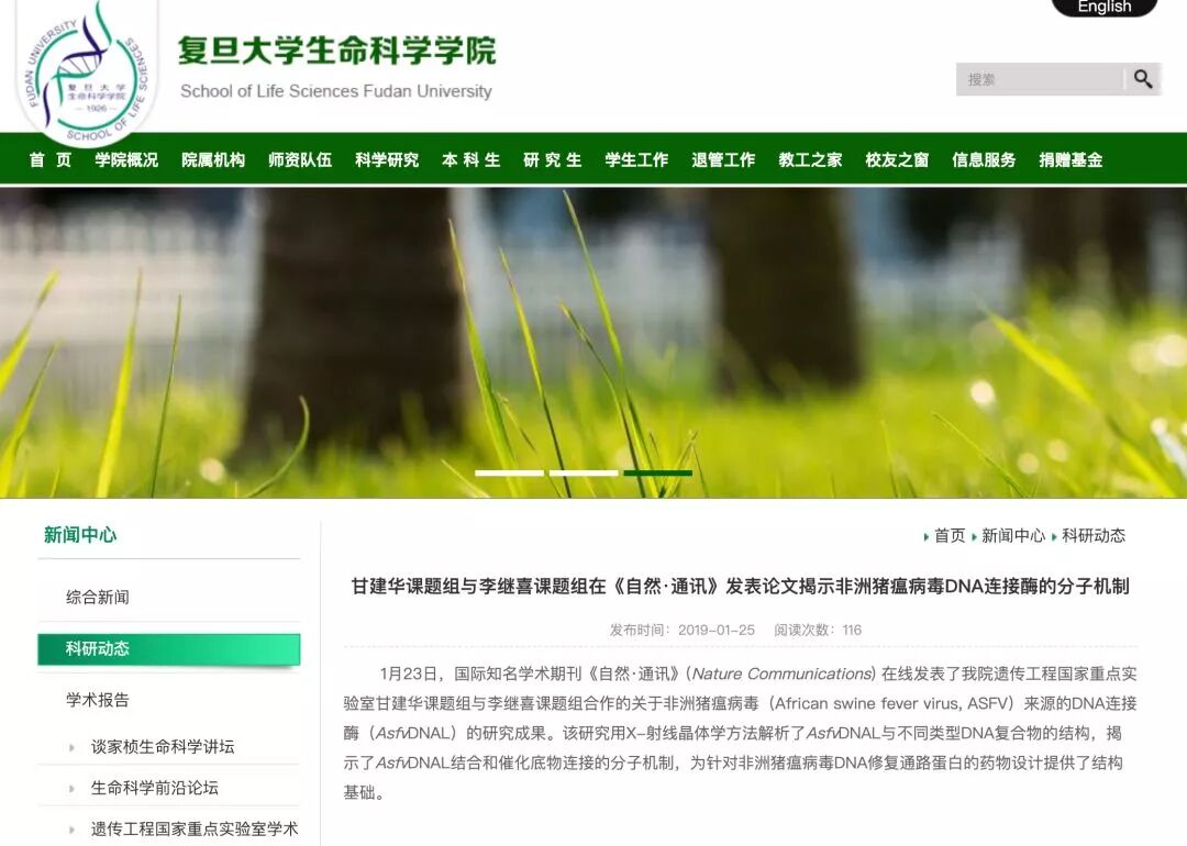 近日,复旦大学生命科学学院研究解析了非洲猪瘟病毒DNA修复通路上一种关键酶的结构。相关研究成果在线发表于《自然·通讯》。 综合科技日报、iNature、复旦大学生命科学学院 非洲猪瘟100%的致死率令养殖场措手不及,侵入猪身体里的病毒为什么可以长驱直入?有没有什么办法能够阻止它的入侵呢? 近日,国际知名学术期刊《自然·通讯》(Nature Communications) 在线发表了复旦大学生命科学学院遗传工程国家重点实验室甘建华课题组与李继喜课题组合作的关于非洲猪瘟病毒(African swine fever virus, ASFV)来源的DNA连接酶(AsfvDNAL)的研究成果。该研究用X-射线晶体学方法解析了AsfvDNAL与不同类型DNA复合物的结构,揭示了AsfvDNAL结合和催化底物连接的分子机制,为针对非洲猪瘟病毒DNA修复通路蛋白的药物设计提供了结构基础。 该项目得到了国家自然科学基金和中国重点研发项目,四川省重点研发项目资助项目。 断尾求生,病毒躲过宿主免疫系统 “人们会发现,患了猪瘟的病猪会发生脾脏肿大,脾脏是重要的免疫器官,那说明它的免疫系统‘奋力作战’了。”李继喜说,但是非洲猪瘟病毒很聪明,在进入体内后会不断变化,让免疫系统“抓不到”。 它的变化很像壁虎的“断尾求生”。“对于宿主免疫系统要攻击的DNA片段,它会剪切掉,然后再重新‘长出来’。”李继喜说。“长出来”意味着DNA的延长、重组,这个过程需要两种DNA聚合酶(X和P)和一种DNA连接酶。 “有这3种酶参与的整个过程形成了一套完整的DNA修复通路。”李继喜说,团队已经解出了其中的一种聚合酶,文章2017年发表,揭示了聚合酶X拥有一个独特的磷酸根识别位点;另一种聚合酶的研究已经收尾,正在进行结果整理和论文编写工作,至此团队已经“全面打通”整个通路的关键节点。 病毒更狡猾的地方在于它新长出来的DNA片段和原来的不同,使得宿主体内的免疫系统措手不及,难以锁定攻击目标。非洲猪瘟病毒也是如此,其基因组修复时会发生突变,让免疫系统无法精准识别,进而使得针对它们的狙击,无法奏效。 分辨率高,晶体法定格“绣娘”手法 俗话说,“万变不离其宗”。既然病毒DNA修复时有千变万化,有没有可能找到所谓的“宗”即保守区呢? 这就要对关键酶进行高精度的结构解析。团队选择了X-射线晶体学方法,与声名鹊起的冷冻电镜方法相比,前者的分辨率更高,且一旦摸索好条件后,更易重复。 结晶条件的摸索却是非常艰难的过程。“我们用基因工程的方法,让非洲猪瘟病毒的连接酶在工程菌中大量表达,通过纯化柱等方法将蛋白纯化出来。”李继喜说。这个时候目标蛋白还在溶液中,与同自己性质、分子量相近的“兄弟姐妹”在一起。 团队进行了上千次相关参数的摸索,最终得到了均一性高的完美晶型,通过X光衍射、三维重构等方法,获得了分辨率达到2.5埃的连接酶分子结构。 在超高分辨率下,科学家可以看到蛋白质中每个氨基酸单体的相互作用、电子密度云的情况,目击氢键间的相互连接,从而判断和预测作为“绣娘”的DNA连接酶将用哪些可能的针法将什么样的DNA片段连接起来。 亲见“凹造型”,锁定药物设计潜力点 预测之后,必须亲见。利用X-射线晶体学方法获取酶与DNA作用的“影像”,将对酶与底物相互作用时的“凹造型”一目了然。 为此,根据已经获得的连接酶分子结构,参考相关文献,团队设计了10几种可能的DNA片段,试试连接酶的“功力”。“DNA片段有长有短,含有的碱基对数量8到20个不等。”李继喜说。 对于这些不同的DNA底物分子,连接酶表现了不同的活性。从本质上说,它们之间的反应是酶促反应。分析发现,非洲猪瘟病毒连接酶在底物催化位点附近具有一些明显不同的氨基酸组成。蛋白突变、体外DNA结合以及活性研究显示,催化位点附近的氨基酸对其与DNA形成复合物及活性至关重要。 李继喜解释道:“单独的酶的构象可以想象成一个三节棍,当和DNA作用时,这个三节棍的三段会发生变化,收拢到一起形成一个‘口袋’状,把DNA关在里面,促成DNA连接反应的进行。” 高分辨率结构显示,该连接酶在N-端具有一个独特的DNA结合结构域(NTD),该结构域对底物结合十分重要。 “这就好比‘口袋’入口的地方有个把门的,这个独特的结合结构域‘认可’了,才能被连接酶纳入到口袋中,促进DNA的反应,如果这个‘把门’的不同意,就无法进行DNA的‘缝合’工作。”李继喜说。 可以针对这个独特的位点设计药物,阻断连接酶的工作,进而掌握抑制病毒的方法。“已有研究发现病毒的成熟颗粒中含有连接酶,也就是说病毒已经进入了宿主细胞,并进行了翻译和组装之后,才会启动连接酶的翻译工作。”李继喜说,因此以该位点为靶点的药物并不能预防非洲猪瘟的感染,而是对猪瘟进行治疗。目前,该团队已经开始与北大团队合作开启化合物的筛选工作。非洲猪瘟病毒里 基因“针线”绣功了得