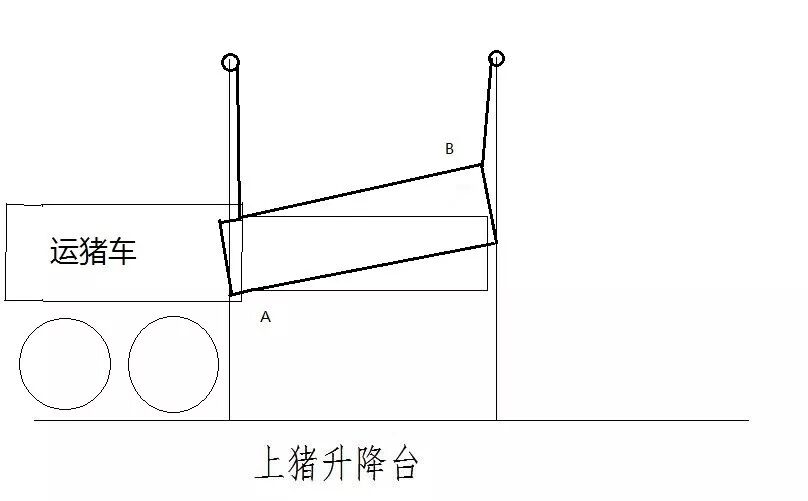 赶猪是一个很累人且很耗时的环节,猪很容易返回,这时也是最容易被感染的环节。为了方便赶猪,改造上猪升降台。设计见图4。首先将平台上升至和猪车一样高,当把猪赶上运猪车时,只须把B端再拉上去即可。