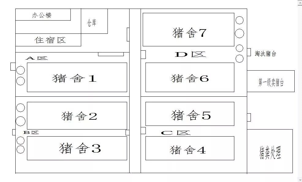 猪场分为四个大区,办公生活区、生产区、猪粪处理区、第一级卖猪台等。各个小区用围墙分开。