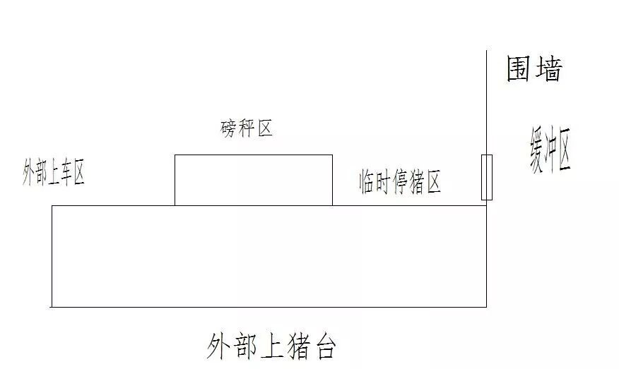 设计:在猪场外50-100米处设立第一级卖猪台,见图1。猪场内生产人员把猪运到此处即止。人、车、物不得越过围墙。由专业卖猪人员用车将猪运至离猪场1公里以外的第二级卖猪台即止,见图3,人车物不得越过围墙。最后由外来人员将猪赶上车。