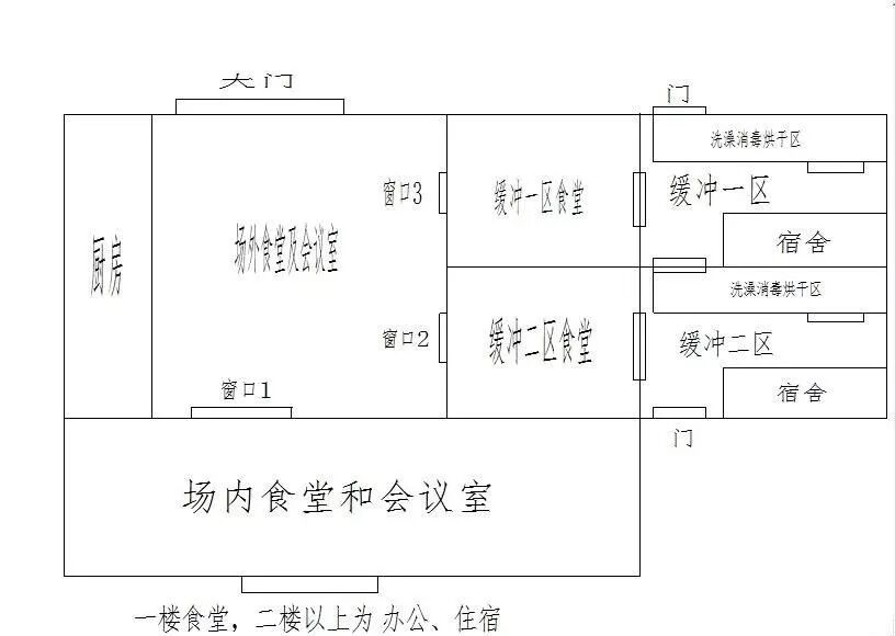 4、食堂四个窗口供应制。分别为场内人员、场外人员、一级缓冲人员、二级缓冲人员等四个窗口。见图2。