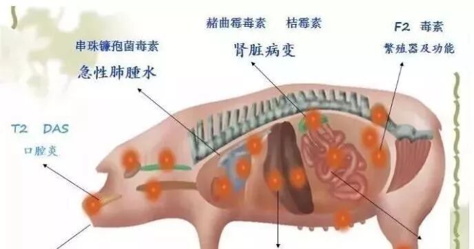 在被霉菌毒素污染的饲料加工中的高温并不能破坏毒素的毒力,而平常养殖者随后添加的霉菌毒素吸附剂多效果不佳,更何况因为饲料的制粒而不能充分接触。