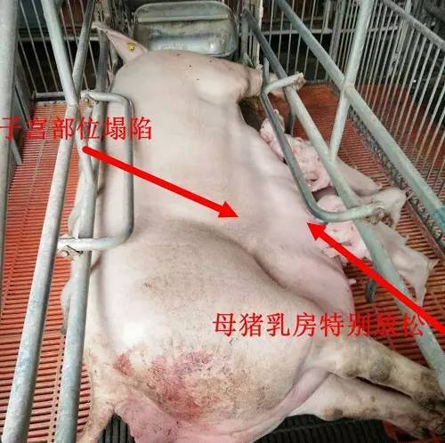未分娩完的母猪肚子是鼓起的,而分娩完的母猪子宫部位是塌陷的,乳房带肌肤相当放松,自然垂下!