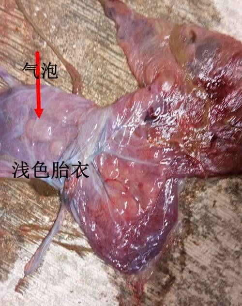 浅颜色胎衣,还有气泡,胎衣很多很厚,母猪已产完!(资料来源:养猪网)