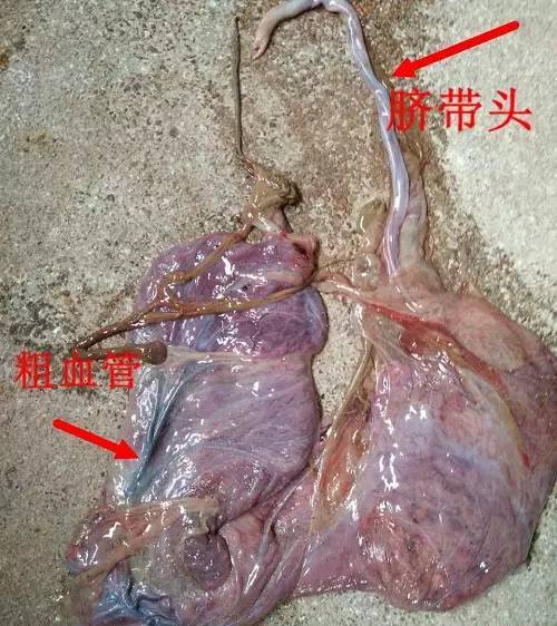 顺着粗血管找脐带头,一头仔猪一个脐带头对应一个胎衣,有特殊情况是一个大胎衣有不只一个脐带头,这时数有几个脐带头,对应几头猪。