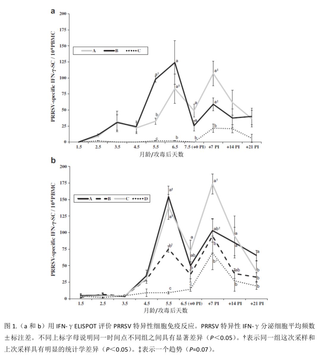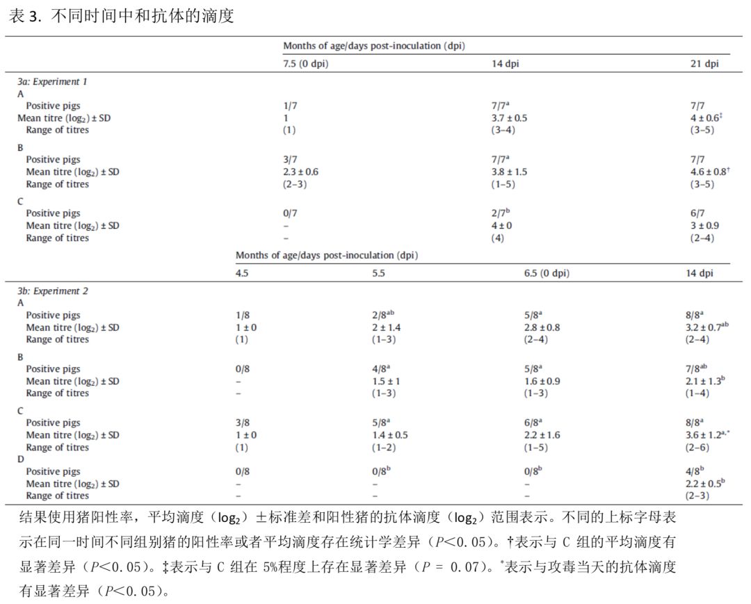 试验1中,免疫两次和多次灭活疫苗后均可诱导高水平的的Y干扰素(IFN-Y)反应。免疫灭活疫苗的猪与未免疫的对照猪相比,攻毒后可以更快产生中和抗体。试验2中,再次免疫灭活疫苗的猪和再次免疫活疫苗的猪产生的中和抗体情况相似。但是,只有C组动物中和抗体滴度在攻毒后明显升高。在诱导细胞免疫反应方面,活+死这样的组合免疫方案要优于单独使用活疫苗。总之,一次免疫的话,活疫苗可以诱导最好的免疫反应。之后,再次免疫灭活疫苗是最好的免疫方案,可以诱导更好的免疫反应。