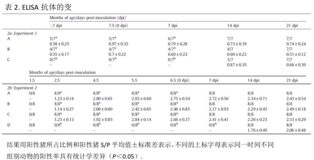 表2a和b总结了ELISA检测情况。试验1中,9/14(64%)的猪在攻毒前血清转阳。攻毒后,A组和B组所有猪在试验结束时血清转阳。攻毒前转阳的猪,S/P值在攻毒后没有明显升高。试验2中,所有接种疫苗的猪(A,B,C组)均在2.5月龄时抗体转阳(活苗免疫后1个月)。S/P值在再次免疫或者攻毒后依然没有明显的升高。两个试验中,对照组的猪在免疫期间保持ELISA和中和抗体阴性。
