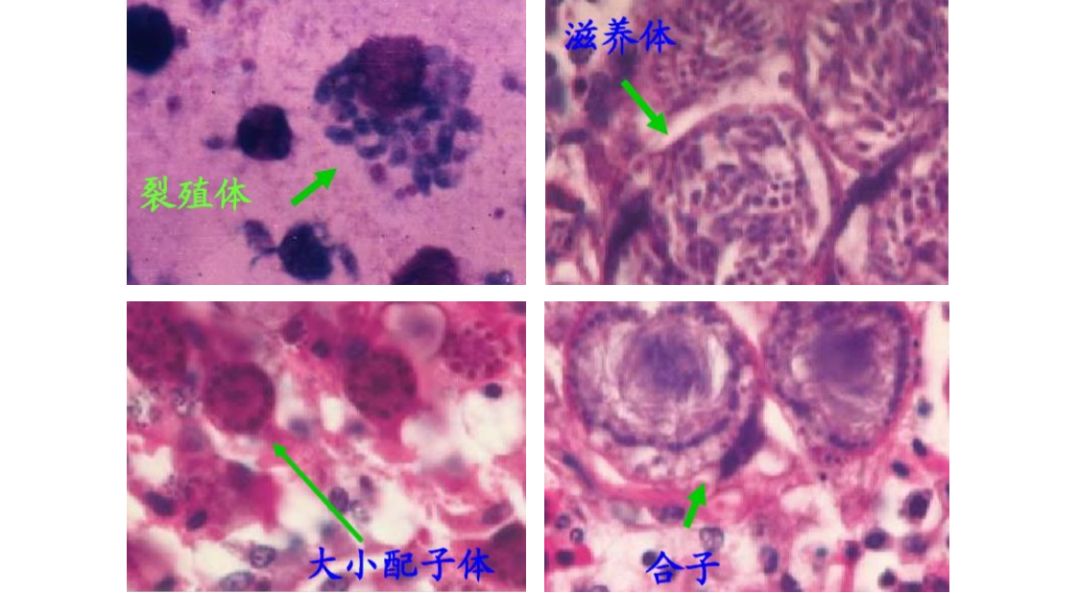 球虫子孢子侵入鸡小肠粘膜的上皮细胞内,在细胞内进行裂殖生殖。然后,发育成滋养体、大小配子体和合子,进行配子生殖。在鸡体内进行的裂殖增殖和配子生殖,这叫球虫的内生性发育。