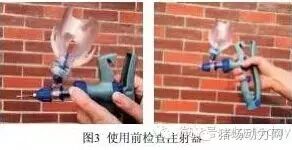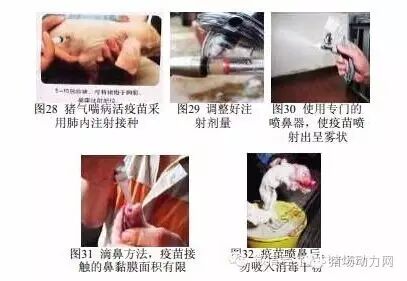 喷鼻操作:1头份伪狂犬疫苗稀释成0.5mL,使用连续注射器,每个鼻孔喷雾0.25mL(图29),使用专用的喷鼻器,用一定力量推压注射器活塞,让疫苗喷射出呈雾状(图30),气雾接触到较大面积的鼻黏膜,充分感染嗅球。过去采用滴鼻方法,不仅疫苗接触到鼻黏膜面积有限,同时仔猪常将疫苗喷出鼻腔,造成免疫失败(图31)。使用干粉消毒剂给初生仔猪进行消毒和干燥的猪场,用疫苗喷鼻后不能让消毒干粉吸入鼻孔内,否则造成免疫失败(图32)。