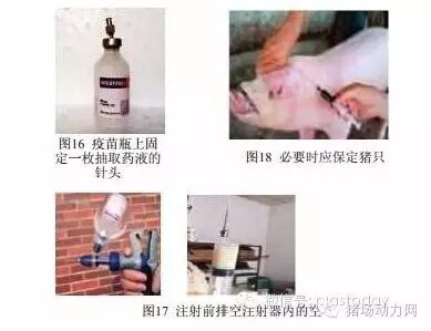使用非连续注射器抽取疫苗时,在疫苗瓶上固定一枚针头抽取药液(图16),绝不能用已给猪注射过的针头抽取,以防污染整瓶疫苗。注射器内的疫苗不能回注疫苗瓶,避免整瓶疫苗污染;注射前要排空注射器内的空气(图17)。