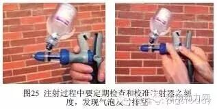 剂量太少则免疫效果差,剂量太大则成本过高,同时可能会产生副反应,尤其毒株毒力大的疫苗;注射过程中要定期检查和校准注射器之刻度,以防调节螺旋滑动造成剂量不准确。注射过程中要观察连续注射器针筒内是否有气泡,发现针管内有气泡要及时排空,否则剂量不足(图25)。
