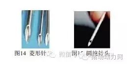 可选择针尖呈棱形头,菱形针头锐利,阻力少(图14),针尖斜面针头圆纯,阻力大(图15)。