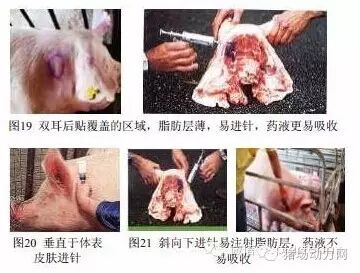 进针的部位为双耳后贴覆盖的区域 :成年猪在耳后5~8cm,前肩 3cm双耳后贴覆盖的区域(图19),这个区域脂肪层较薄,容易进针到肌肉内,药液容易吸收。垂直于体表皮肤进针直达肌肉(图20)。