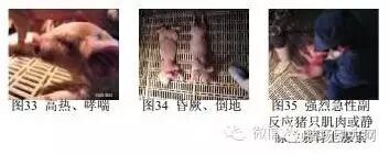 强烈急性副反应猪只抢救:疫苗接种后5分钟到1小时发生,高热、哮喘(图33)、绝食、昏厥、倒地(图34)、休克等强烈急性副反应猪只肌肉或静脉注射肾上腺素(图35),每50kg体重注射1mL,20~30分钟后再次注射。