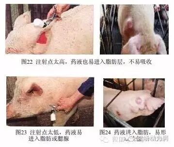进针部位和角度不当,常将药液注入脂肪层,如斜角向下进针,容易注射脂肪层(图21);注射点太高,药液被注射入脂肪层(图22);注射部位太低,药液会进入脂肪或腮腺(图23);药液注入脂肪层,容易造成局部肿胀、疼痛、甚至形成脓包(图24),需避开脓包注射。如打了飞针或注射部位流血,一定要在猪只另一侧补一针疫苗。