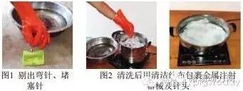 用清洁纱布包裹清洗后的每具金属注射器及针头,然后放入窝中煮沸消毒(图2),煮沸后时间不少于15分钟,待针管冷却后方可使用。