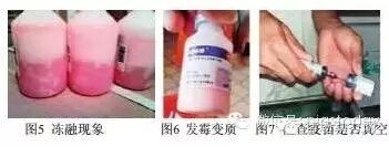 检查疫苗外观、颜色是否异常,是否有发霉变质现象,如有此现象则不能使用(图5);检查疫苗是否有冻融现象,是否有大量沉淀、分层现象等,如有此现象则不能使用(图6);包装是否破损,冻干疫苗稀释时要检查是否真空,真空疫苗会自动吸入注射器的药液(图7),不是真空的疫苗不能使用。