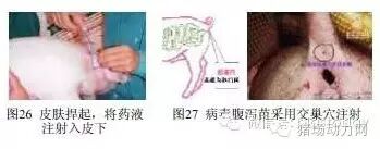 猪布氏杆菌病活疫苗要皮下注射,皮下注射方法:在耳根后方,先将皮肤捍起,将再药液注射入皮下(图26),即将药液注射到皮肤与肌肉之间的疏松组织中。