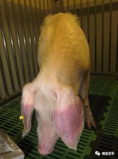 图 25.2 ASF亚临床感染,由于高度充血造成猪耳朵呈现紫色