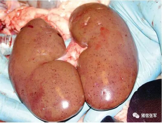 图 25.4 ASF感染猪的肾脏皮质部表面有许多出血斑