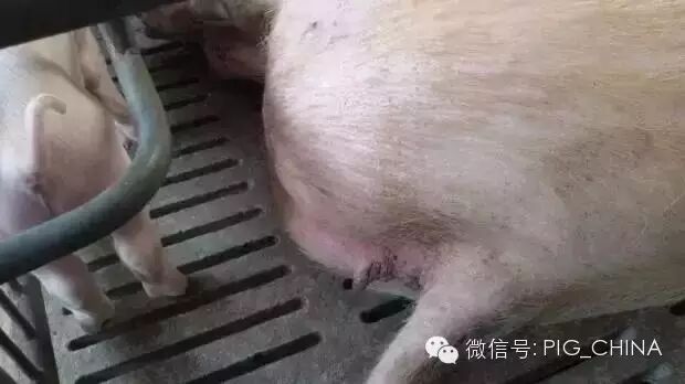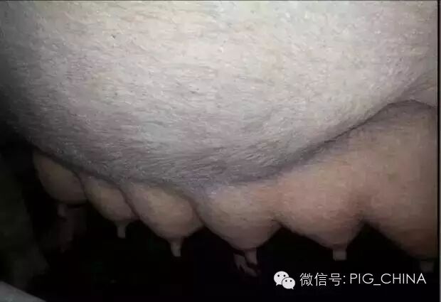 如果母猪所有乳房呈一整块相连,或者带仔后期前面几对乳房独立丰满,而后面几对乳房形成连接,站立时连接在一块的乳房形成巨大的垂袋,这种现象的产生有饲料的原因,主要还是品种因素,选购其种猪时慎重。犹其是后面乳房形成巨大的垂袋的母猪,其后代一般会出现同样的现象,带仔时,这些乳房奶水将会不足,建议不要购买。