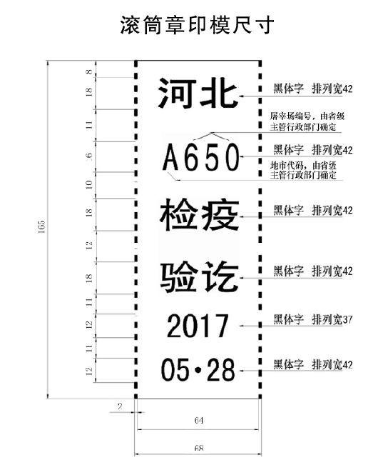 为解决生猪胴体上检疫验讫印章规格大小、印油颜色不一致等问题,我部组织对各地目前使用的生猪屠宰检疫验讫印章进行了研究,在基本保持原有样式基础上,对尺寸等进行了统一规范,自本通知印发之日起启用(样式见附件1)。同时规定,对检疫合格肉品加盖的验讫印章印油,颜色统一使用蓝色;对检疫不合格的肉品加盖的“高温”或“销毁”章印油,颜色统一使用红色。印油必须使用符合食品级标准的原料。已经得到批准使用针刺检疫验讫印章、激光灼刻检疫验讫印章的,其印章印迹应与本通知规定的检疫验讫印章的尺寸、规格、内容一致,所用原材料材质必须符合国家规定,不能对生猪产品产生污染。