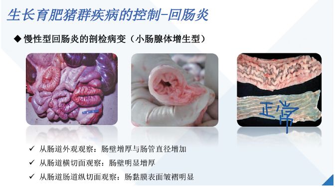 “国内所检测猪场的胞内劳森菌检出率100%。”肖海君介绍道,胞内劳森菌感染隐窝的未成熟的肠上皮细胞,感染的未成熟肠上皮细胞的大量增生,肠上皮细胞堆积,导致肠壁增厚,肠绒毛萎缩或者脱落出血,从而导致营养吸收障碍。回肠炎临床的临床表现多样性,其中亚临床感染表现为猪群整齐度下降,日增重降低,出栏时间延长,养殖成本升高。6-20周龄保育育肥猪群常表现典型的慢性回肠炎临床症状,发病猪群发病中后期逐渐消瘦,猪群整体度下降,出现腹泻症状。4月龄以上生长育肥猪与后备母猪常表现典型急性回肠炎的临床症状,发病猪拉黑红色血便,猪皮肤发白,可能出现突然死亡。