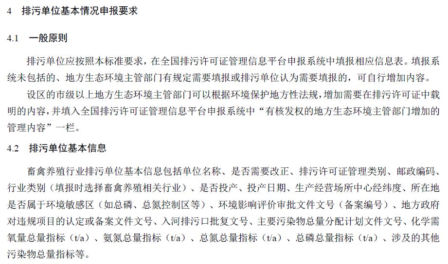 为贯彻落实《中华人民共和国环境保护法》《中华人民共和国水污染防治法》《中华人民共和国大气污染防治法》《中华人民共和国固体废物污染环境防治法》《中华人民共和国土壤污染防治法》《畜禽规模养殖污染防治条例》等法律法规、《国务院办公厅关于印发控制污染物排放许可制实施方案的通知》(国办发〔2016〕81 号)和《排污许可管理办法(试行)》(环境保护部令第 48 号),完善排污许可技术支撑体系,指导和规范畜禽养殖行业排污单位排污许可证申请与核发工作,制定本标准。 本标准规定了畜禽养殖行业排污单位排污许可证申请与核发的基本情况填报要求、许可排放限值确定、实际排放量核算和合规判定的方法,以及自行监测、环境管理台账与排污许可证执行报告等环境管理要求,提出了畜禽养殖行业污染防治可行技术要求。本标准的附录 A 和附录 B 为资料性附录。本标准为首次发布。 《排污许可证申请与核发技术规范 畜禽养殖行业》规定了畜禽养殖行业排污单位排污许可证申请与核发的基本情况申报要求、许可排放限值确定、实际排放量核算、合规判定方法以及自行监测、环境管理台账与排污许可证执行报告等环境管理要求,提出了污染防治可行技术要求。 该标准适用于设有污水排放口的规模化畜禽养殖场、养殖小区(具体规模化标准按《畜禽规模养殖污染防治条例》执行)的排污许可管理。粪污处理采用资源化利用模式的规模化畜禽养殖场、养殖小区不适用该标准。排污许可证申请与核发技术规范 畜禽养殖业