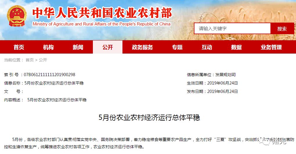 6月24日,农业农村部网站发文《5月份农业农村经济运行总体平稳》指出,非洲猪瘟疫情得到有效控制,禽肉等替代品供应增加;5月猪肉价格涨幅较大,集贸市场月均价为每公斤24.71元,同比上涨26.6%,但仍低于近5年平均水平;进口美国农产品金额由上年同期的732.2亿元降至327.3亿元,下降55.3%。