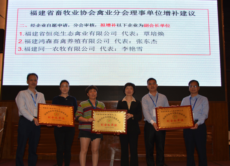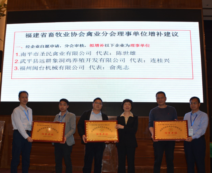 会议审议通过了理事单位增补建议,同意增补南平市圣民禽业有限公司、武平县远耕象洞鸡养殖开发有限公司、福州闽台机械有限公司等3个单位为理事单位,同意增补福建省恒亮生态禽业有限公司、福建鸿森畜禽养殖有限公司、福建同一农牧有限公司等3个单位为副会长单位。