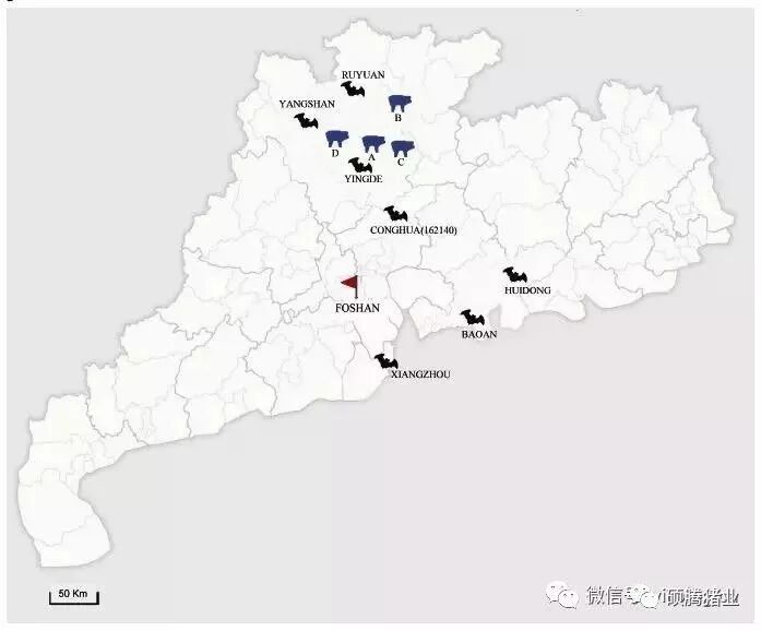 注:在CONGHUA取样点发现的一株蝙蝠冠状病毒与引起此次猪场疫情的SADS-CoV全基因组序列一致性高达98.48%。红色小旗标识的佛山市是2002年SARS疫情首例确诊者所在地。