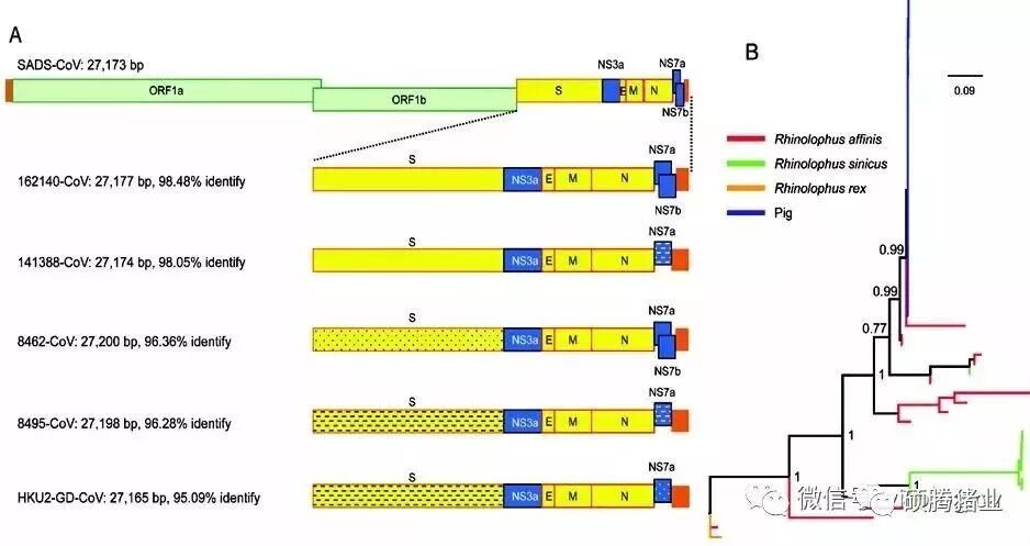 图1 SADS冠状病毒与蝙蝠HKU2相关冠状病毒的基因组比较(A)和囊膜蛋白S1基因进化分析(B)