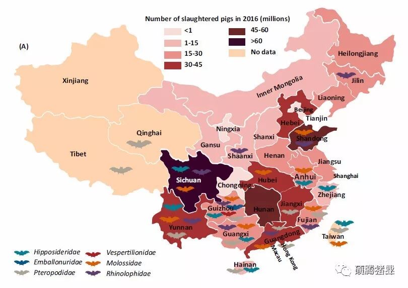 病毒宿主范围扩展的另一个条件是不同物种宿主之间的物理接触。该新型SeACoVs在广东省均有发现,而紧密相关的蝙蝠冠状病毒也于广东或香港分离(图1A)。在广东省,猪屠宰场的高密度和蝙蝠种类的广泛分布(图2A)促进了病毒跨物种传播的可能性。此外,蝙蝠在中国南部地理分布广泛,具有广泛的物种多样性、独特的行为(典型的飞行模式,饮食,栖息和流动性)以及与猪和人类的持续互动(图2A)等特点。