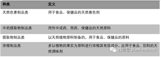 植物提取物(Plant Extract)是指以植物(包括组织、果实等)为原料,经过物理化学提取分离过程, 定向获取和浓集植物中的某一种或多种有效成分,而不改变其有效成分结极所形成的产品。它可作为原料,广泛应用于食品饮料、药品、保健品、化妆品等下游行业。 植物提取物种类众多,目前进入工业化提取的种类超过300种。其分类方法有多种,根据有效成分的 含量可分为有效单体提取物、标准提取物和比率提取物三类;按成分分为甙、酸、多酚、多糖、萜 类、黄酮、生物碱等;按照产品形态可分为植物油、浸膏、粉、晶状体等。按照用途,植物提取物 又可分为天然色素制品类、中药提取物制品、提取物制品类和浓缩制品类。