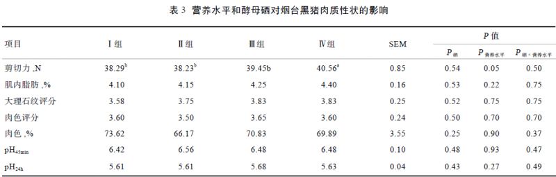 3.2 营养水平和酵母硒对烟台黑猪肉质性状的影响